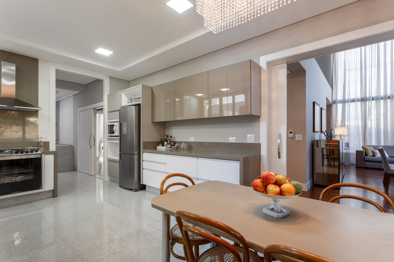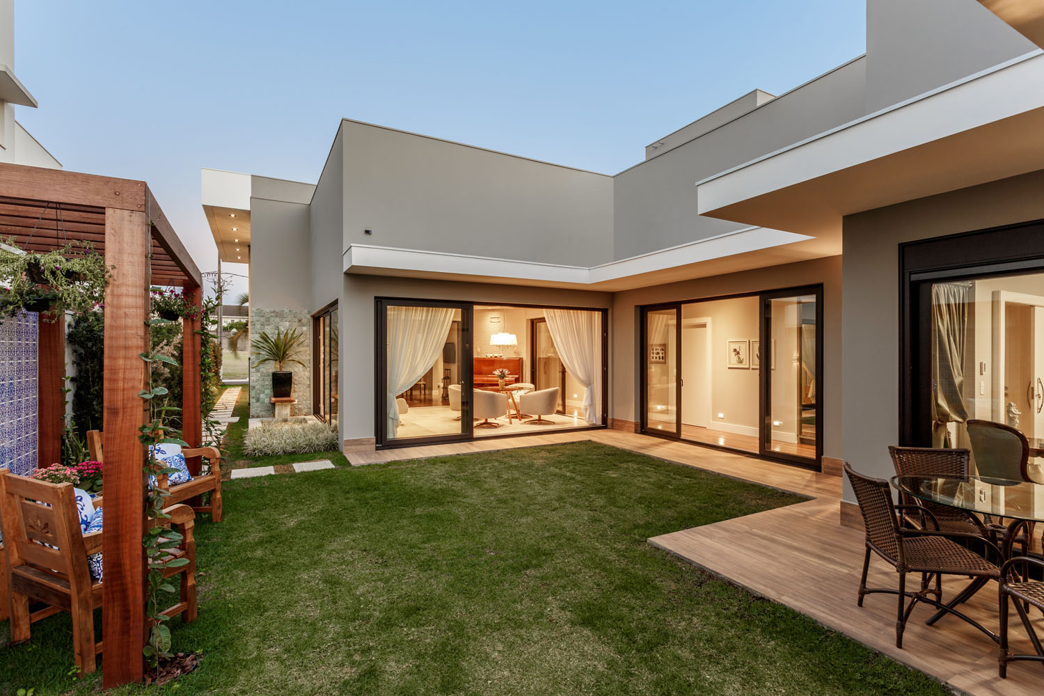 A proposta deste projeto foram linhas retas e puras integrando os jardins externos, que trazem luz e frescor, com uma sala com elevado pé-direito.